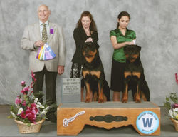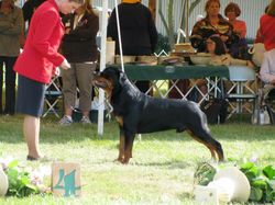 Thor is a joy wherever he is. He can go to the kids football games and have small children climb all over him, and the next day hit a show and give me everything I ask of him. He is more than his wins in the ring; he is part of our family. His intelligence, loyalty and sense of humor are what we make him my heart; his showiness and extreme Rottweiler type make him an excellent show dog. He is just, overall, a truly remarkable Rottweiler.